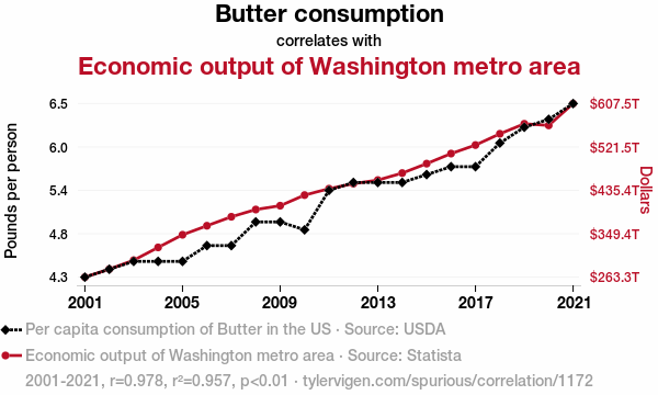 As you can see, butter consumption is positively correlated with the economic output of the Washington metro area. Needless to say, I highly doubt butter consumption was actually “greasing the wheels” of the local economy in the Washington metro area! It is therefore imperative that we don’t conflate association with causation when we’re conducting service evaluation as well.