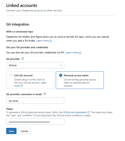 - Populate the form with GitHub as the Git Provider and your own user name. This is where you can paste your Personal Access Token.