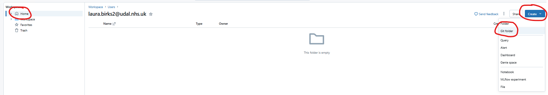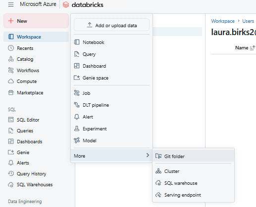 - In your Home (personal) area of Databricks, click Create and then Git Folder.