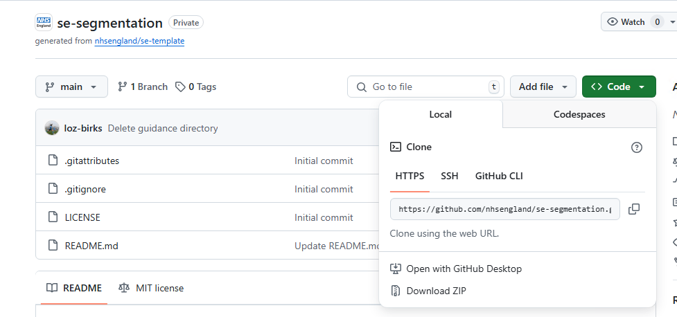 - If you do not already have a repo you want to clone, you can create one on GitHub. Feel free to use the SE github template which will initialise a repo with a gitignore, SOP folder and template, and README template with some key reporting info for you to easily edit.