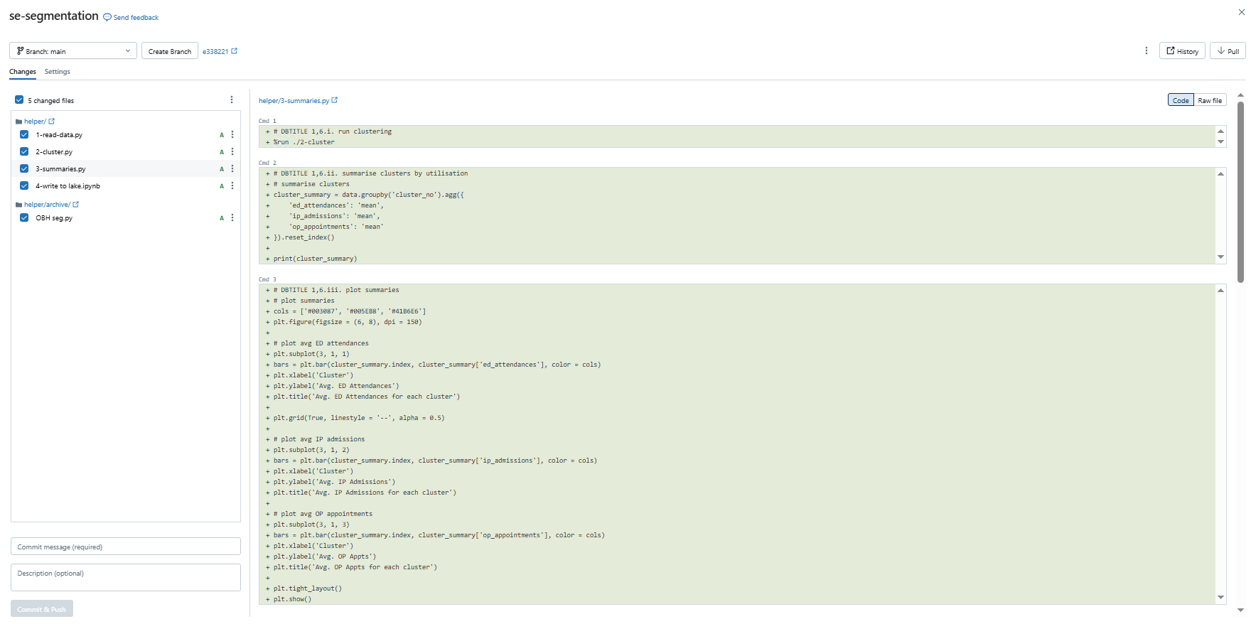 Once you’ve made any changes, open up the Git window. Any files which have been changed will appear on the left with the changes on the right. Select which changes to commit and add any commit messages before hitting Commit & Push. Notice that the Databricks integration pushes commits automatically.
