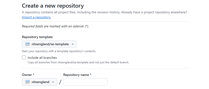 Remember to create your repo in the nhsengland area, not your personal GitHub, otherwise when you transfer it you will lose your admin privileges! You should also add the South East D&A Team and the everyone team to the permissions.