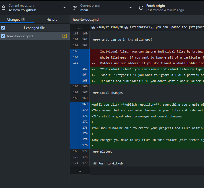 Any changes you save in any files in this folder (that aren’t ignored) will appear in the GitHub desktop changes section. You can see which file has changed, what has been removed (red), and what has been added (green). If you like the changes, ensure that the tick box is checked on the left of the file name, name your commit and add a description (optional), and click Commit to main.