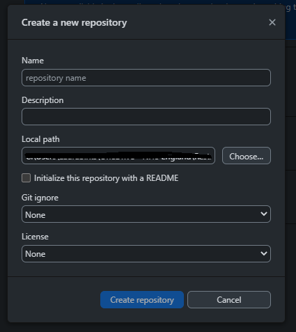 Even though it looks a little different, a lot of the process to create a repo in GitHub Desktop is similar to that of creating a repo in the browser, see here for a reminder. The main difference is that your repo will live locally until you choose to publish to GitHub, so no need to choose where it lives or privacy settings. You will, however need to choose which local file to put the repo folder- this will be where you save all your code.