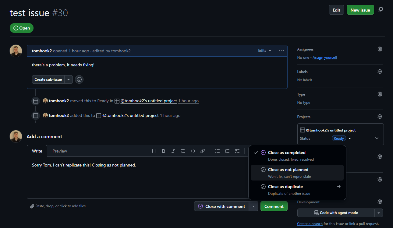 - Not planned - e.g. decide not to make the change, can’t reproduce the bug, change no longer required
