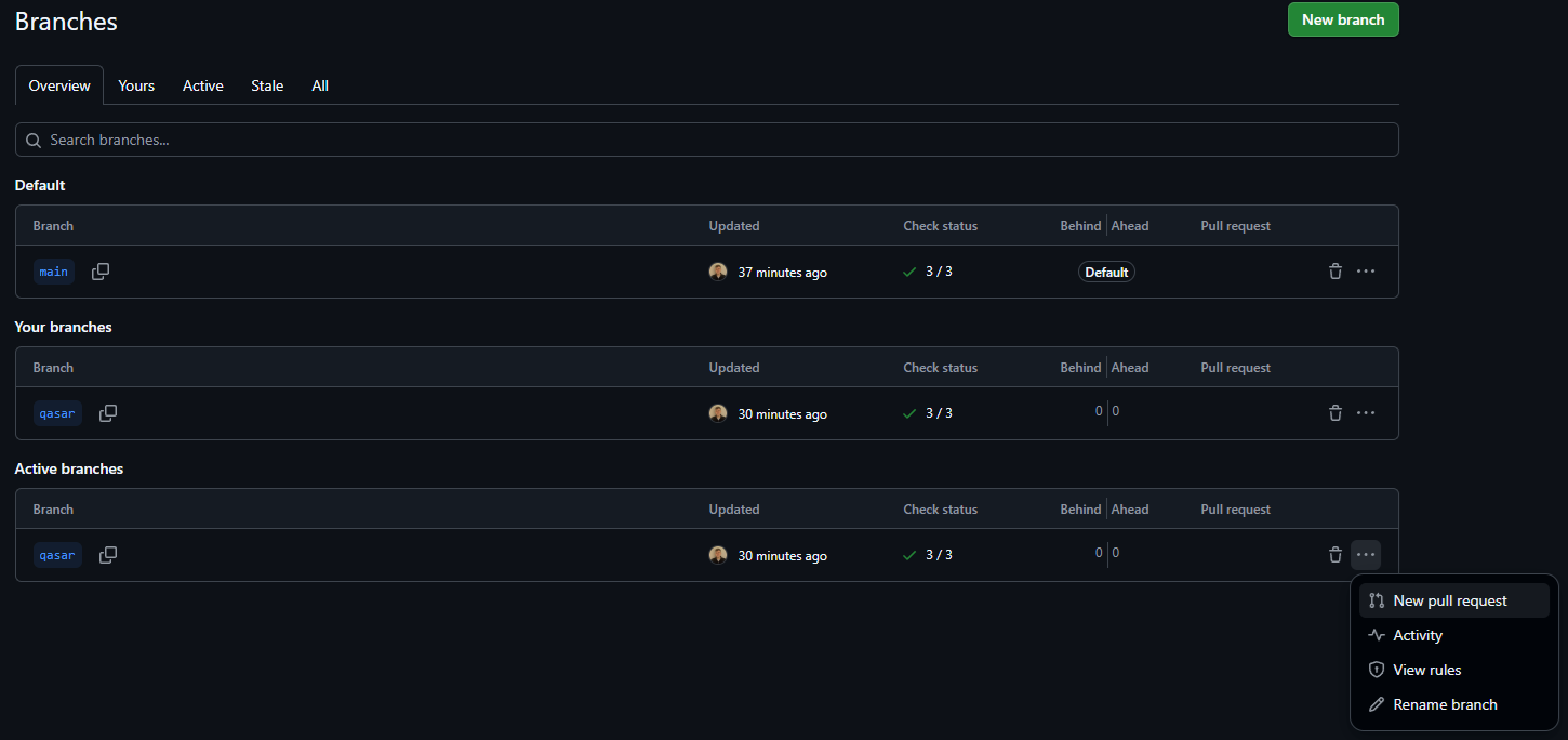 New developments and changes should be coded in their own branch: one branch per ‘feature’. Give the branch a name that helps you identify what a change relates to.