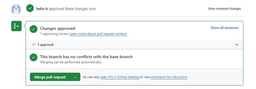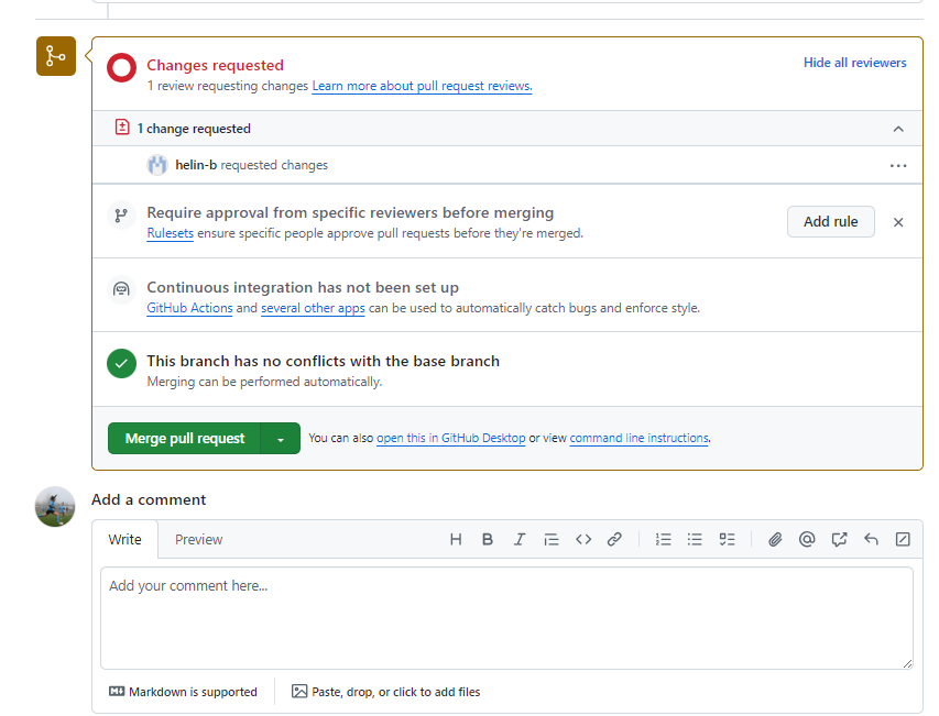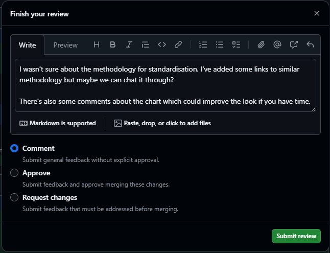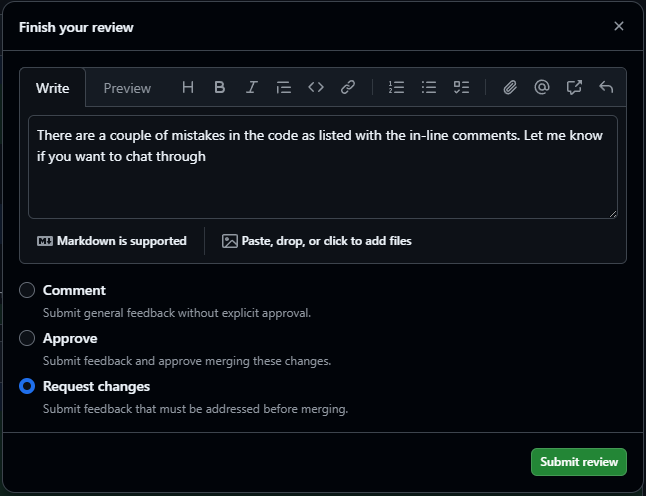 If as the reviewer, you’ve spotted something which needs to be changed before being merged into main, you can request changes to deny the pull request until those are actioned.