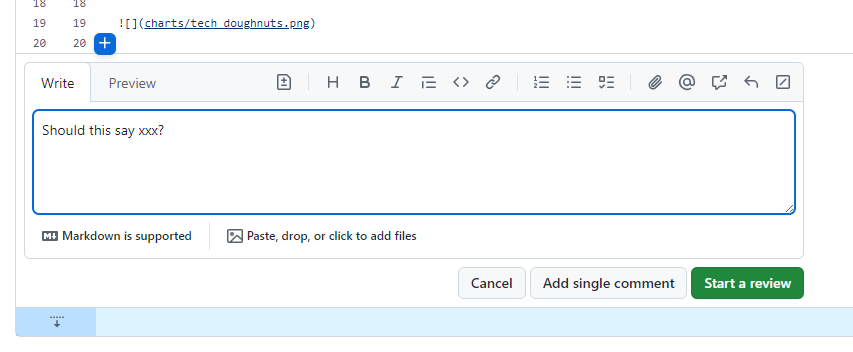 Comments can be added in-line with code. If you do this, click Start a Review if you want all the comments to be sent over at once, at the end of your review.