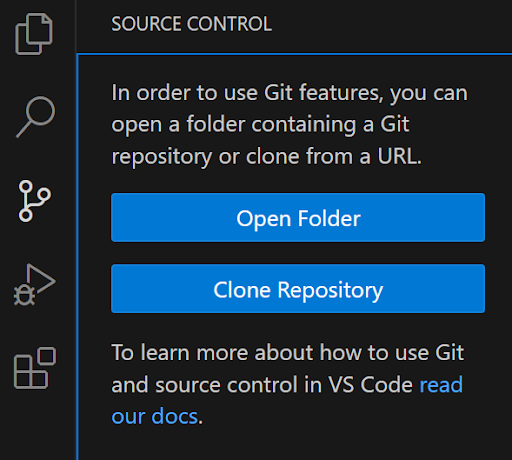 (Note: if you’re already working on a repo, you can clear what you’re working on by opening a new window (File -> New window) or by closing the current folder (File -> Close folder)).